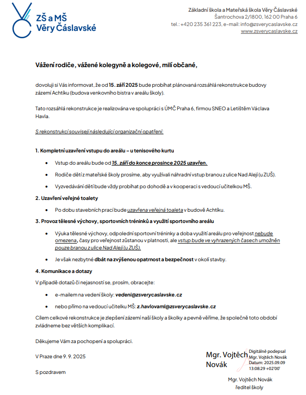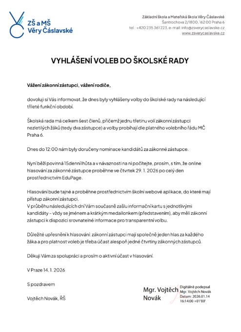 Žádáme rodiče, aby sledovali webové stránky školy, kde budou zveřejňovány další aktuální informace.